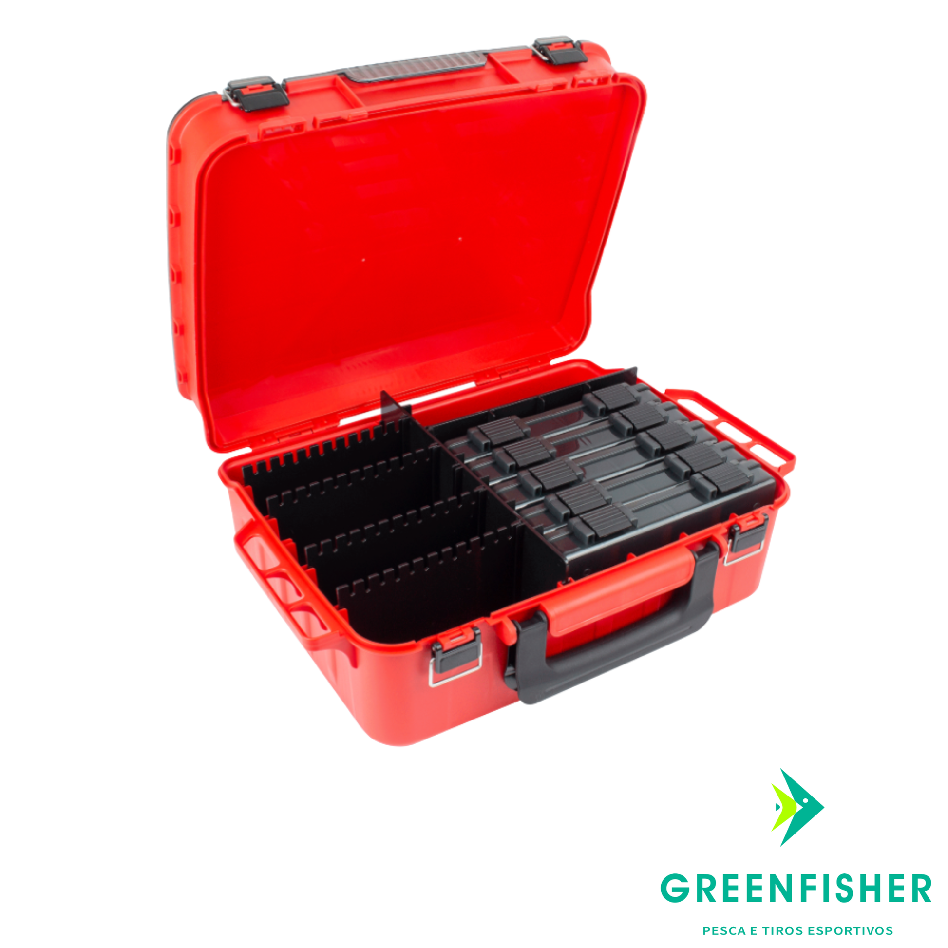 Interior Modular de Alta Capacidade: O compartimento inferior inclui 4 suportes exclusivos para Spinner Baits e espaço amplo para organizar o restante do seu arsenal.